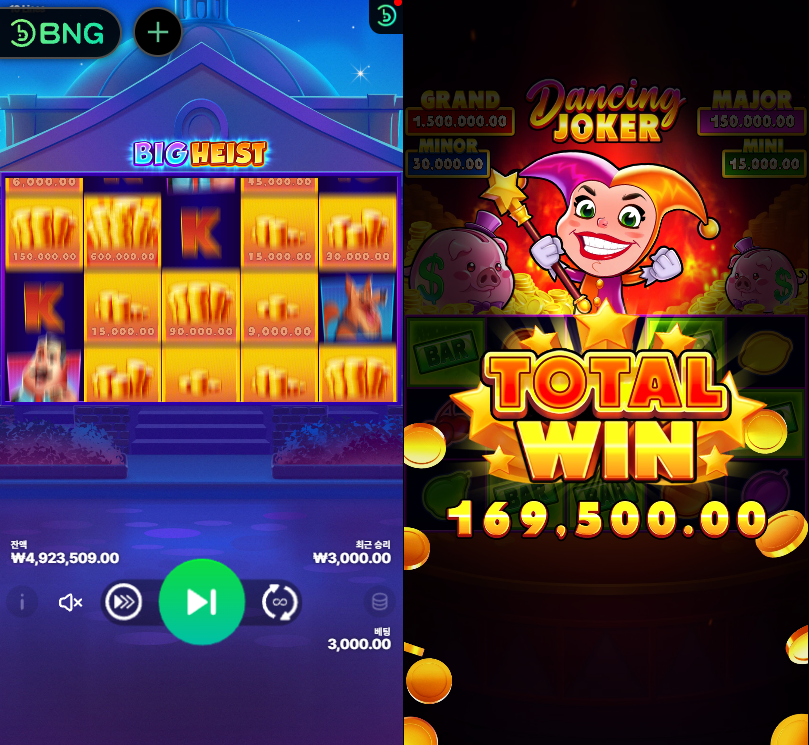 왼쪽 빅 하이스트 보면서 오른쪽 댄싱 조커까지 같이 돌렸는데 오른쪽에서 빵 터졌습니다 하나 안 되면 바로 옆에 거 보면 되니까 멘탈 관리도 되고 멀티 기능 꼭 써보세요 강추합니다