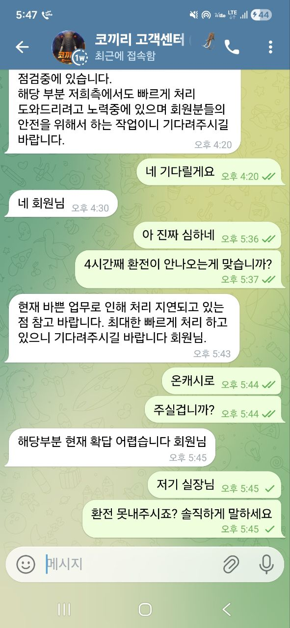 평소 온캐시로 환전을 내주다가 3300만원 환전신청하니 환전장이 지급정지되서 조치중이라고 기다리랍니다. 그렇게 시간이 흐르고 7일 8일이 지나서 물어보니 같은 답변만 오길레 짜증내니