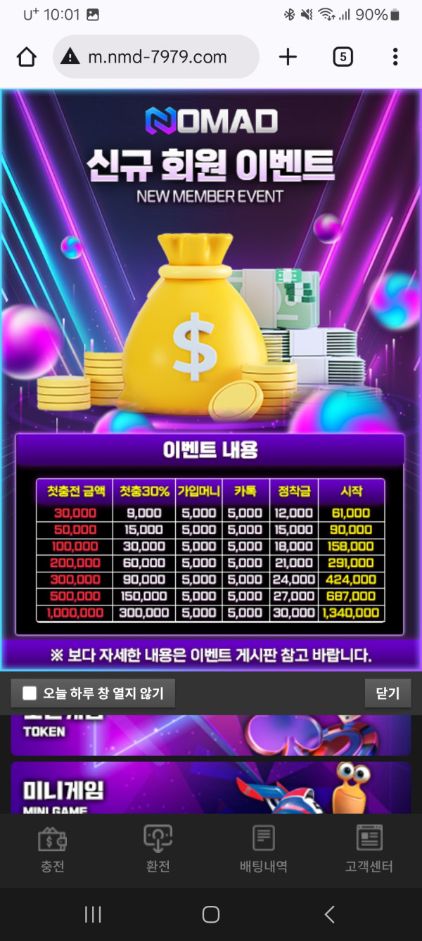 노마드는 입금 환전 시스템 정말 잘 갖춰져있고 환전 속도 엄청 빠릅니다 인터페이스가 되게 깔끔해요 신규 이벤트 이렇게 사진처럼 있는데 정착금에 카톡보너스에 가입머니까지 완전 혜자스럽게 시작해 볼 수 있습니다
