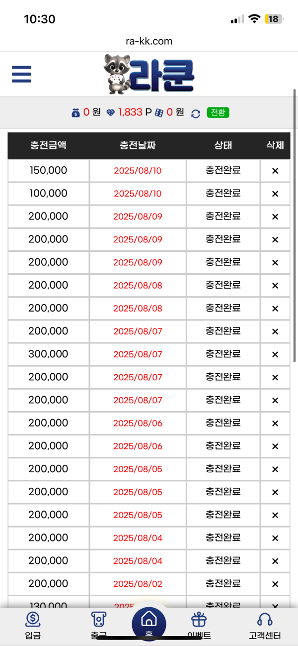 라쿤은 먼저 신규입플 이벤트 그리고 이사비이벤트 누적충전이벤트 기프티콘이벤트 다양하게 진행하고 있습니다