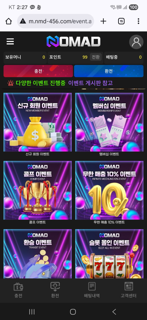 제가 믿고 쓰는 사이트 노마드는 이벤트도 정말 많고 유저들에게 더 많은 혜택을 제공해주며 스포츠 종목도 다양하고 해외형 배팅 기준점이 많으면서 배당도 높습니다. 미니게임도 다양한 게임 있습니다.