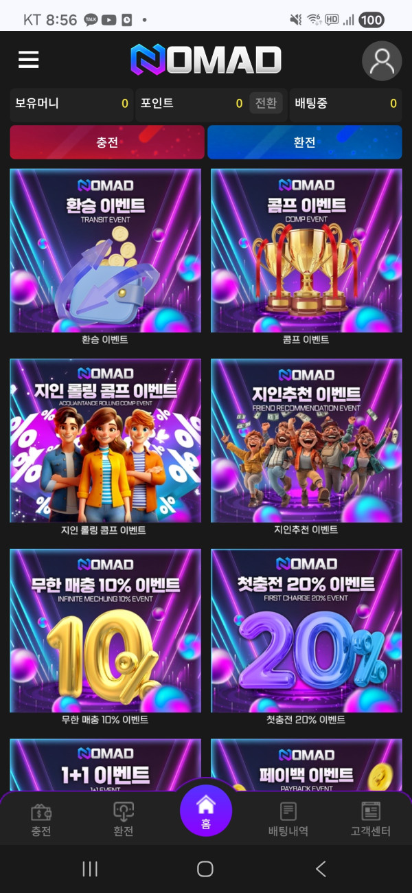 제가 믿고 쓰는 사이트 노마드는 이벤트도 정말 많고 유저들에게 더 많은 혜택을 제공해주며 스포츠 종목도 다양하고 해외형 배팅 기준점이 많으면서 배당도 높습니다. 미니게임도 다양한 게임 있습니다.