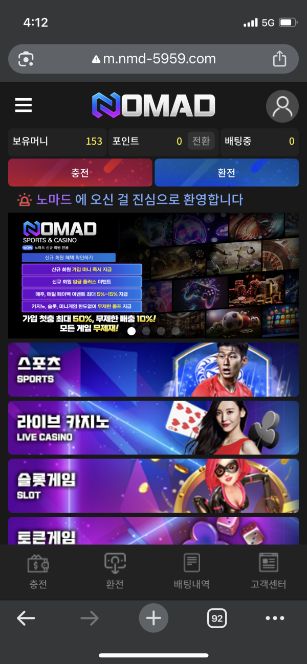 노마드 빠른입출금과 다양한 이벤트 많습니다!! 지인추천 후기이벤트 출석체크 생일이벤트 등등 많고 첫매충도 확실하게주고 사이트 자체의 케어도 깔끔해서 오랫동안 정착하기 괜찮은사이트인거같습니다 ㅎㅎ