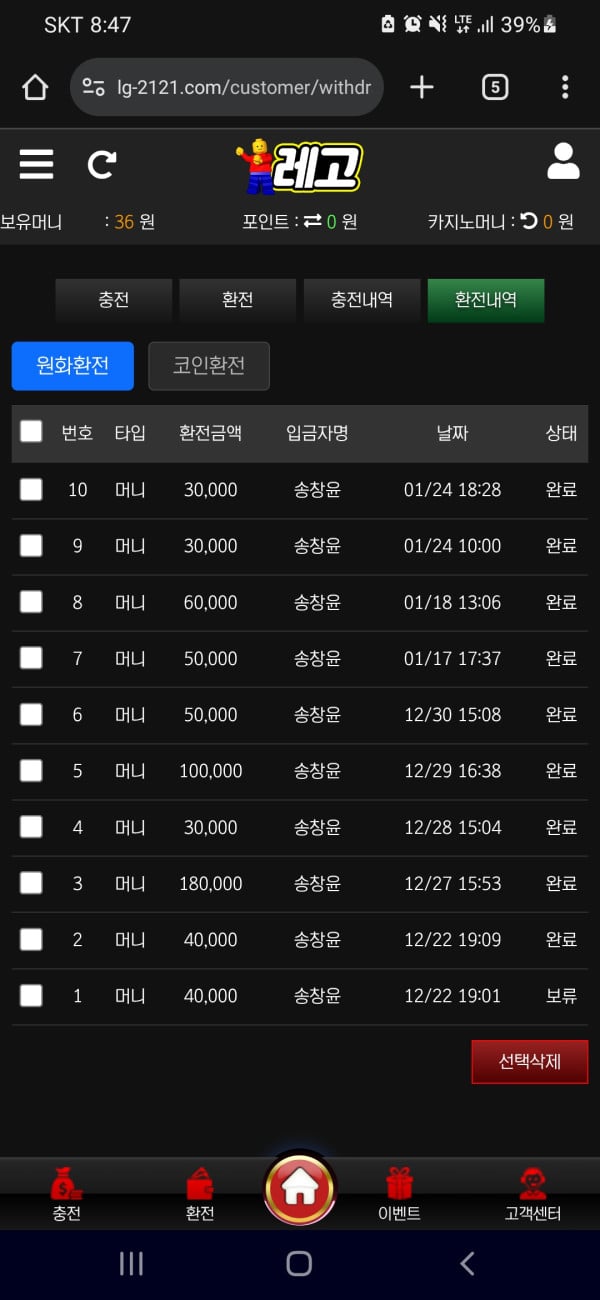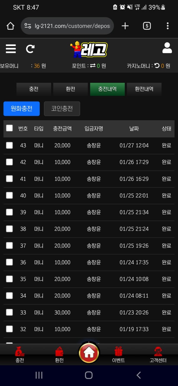 안녕하세요레고후기남겨요 사이트깔끔하게정리잘되어있고 특히 충.환빠르고 이용하는데 너무편하고 문의응대도 너무친절하고 잘해주셔서 기회가된다면 같이이용했으면좋겠슺니다