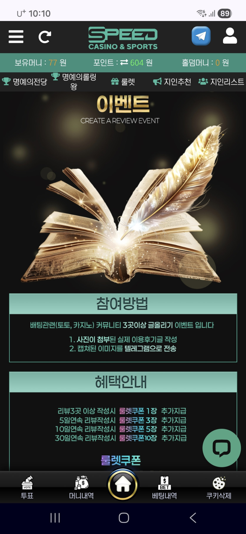 안녕하세요 스피드 5만원 충하기만하면 최대 77만원 룰렛 얻울수 있으니 꼭 제발 많괂부 부탁드립니다 🙏