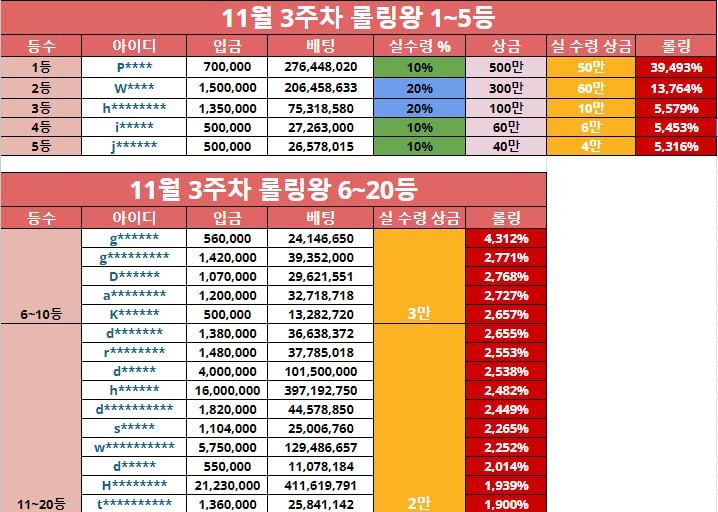 2023 11월 3주차 5억 롤링왕 이벤트 순위 발표드립니다.
