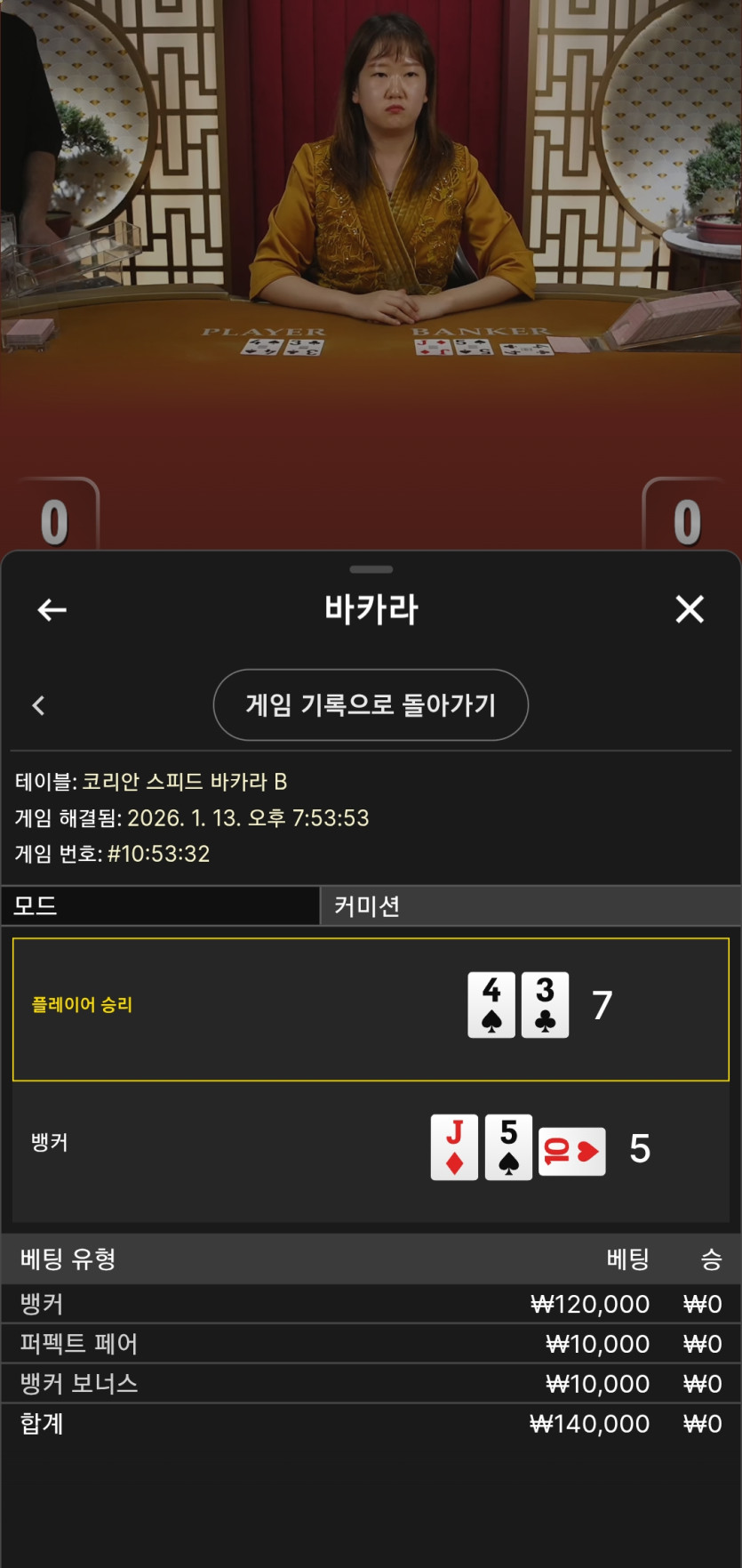 딜러가 화면상에 뱅커추가카드띄어서 9됐는데 결과는 7대0플처리됨 카드가2장나왔다고 개소리시전