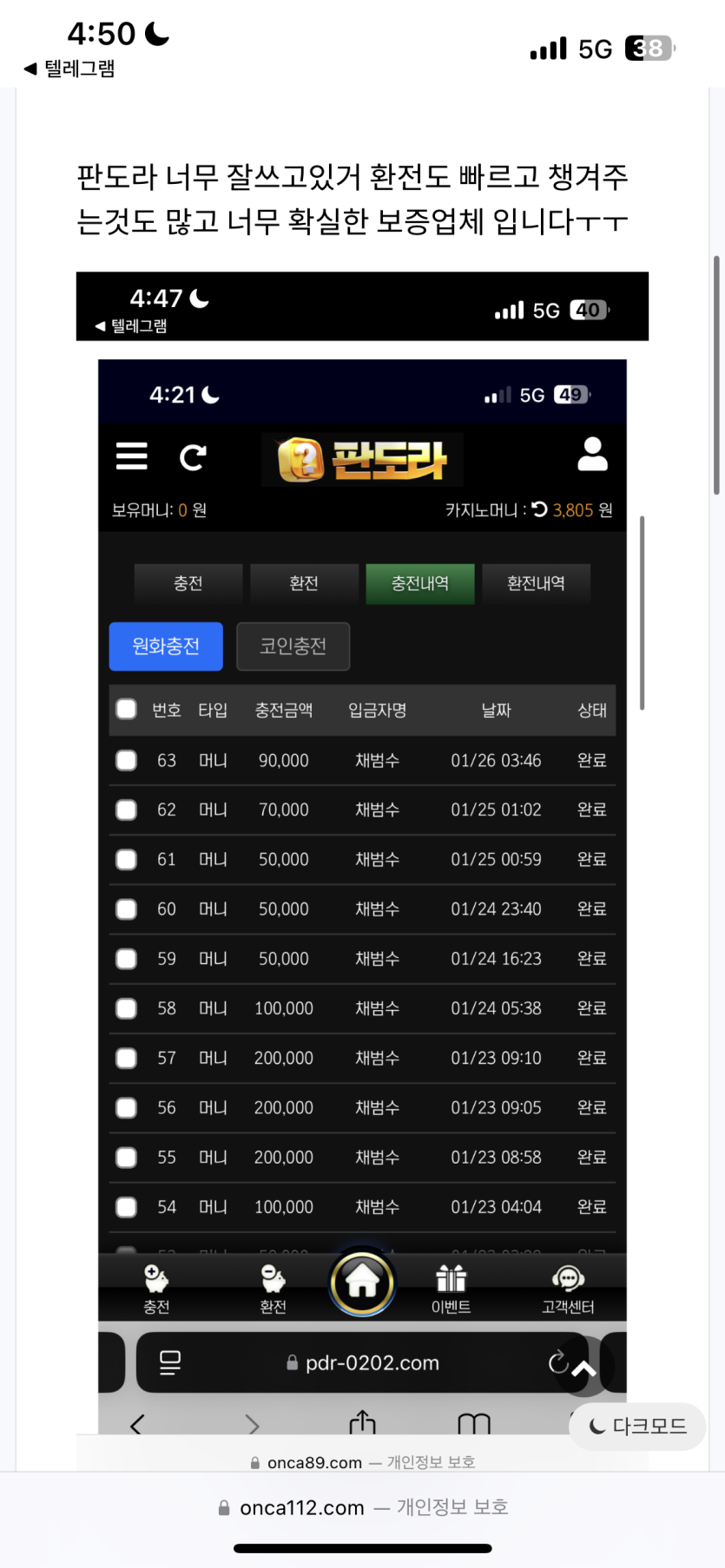 판도라 이벤트도 많고 충전신청 하면 바로 충전 완료 되는점이랑 텔레로 궁금한점 물어보면 친절하게 알려주셔서 좋응거같아요