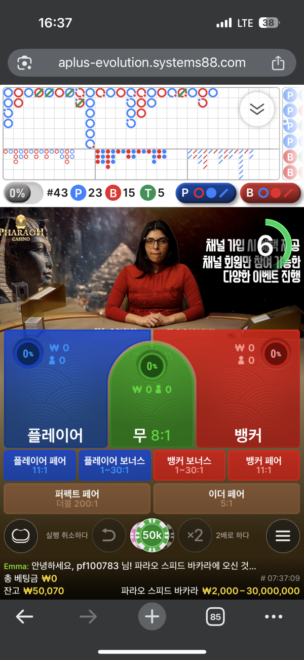 속도나 진행 흐름은 여전히 괜찮은 편입니다. 파라오 스피드 바카라는 말 그대로 템포가 빠르다 보니 괜히 지루하게 기다릴 필요가 없어서 자주 찾게 되네요. 딜러들도 대체로 무난하고, 크게 딜레이 걸리거나 불편한 부분은 없었습니다.