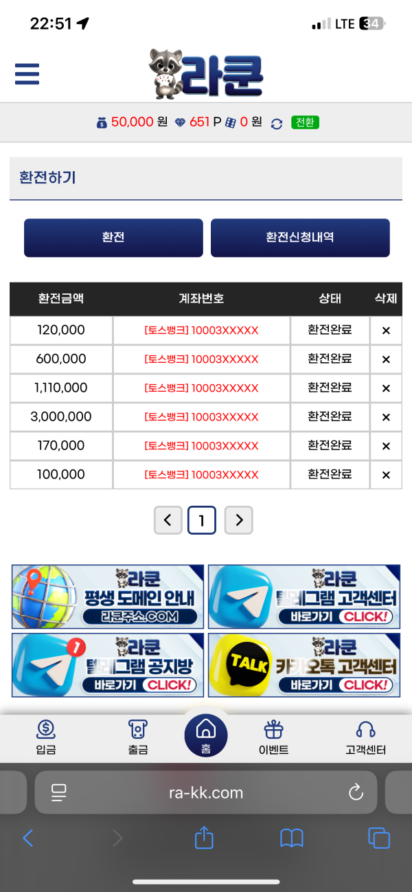 라쿤 신규이벤트 타사이트에 비해 진짜 빵빵하고 텔레친추 이벤트, 신규입플, 신규정착이벤트 놓치지 말고 다 받아봐요 환전이 진짜 빠르니까 이용하기 편하네요