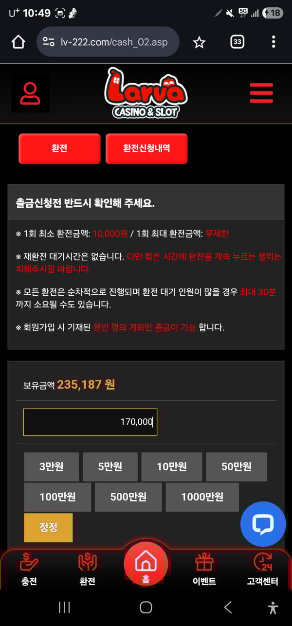 해당 이벤트머니는 즉시 환전 가능 , 베팅시 롤링 500%입니다