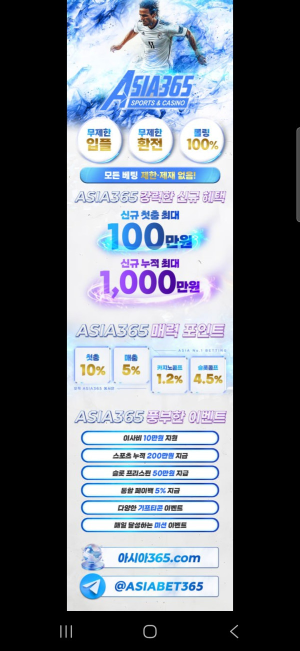 아시아365 제가사용하고있는 사이트 후기적습니다. 페이백 , 누적충전 , 지인추천 , 출석체크 ,신규가입혜택 등 다양한 이벤트와 저는 스포츠를 좋아해 스포츠배팅을 자주하는데 다양한기준점의 핸디 , 빠른 충환전으로 어느사이트보다 편하고 이용하기 좋더라고요. 한번 이용해보세요 강추드립니다 !!